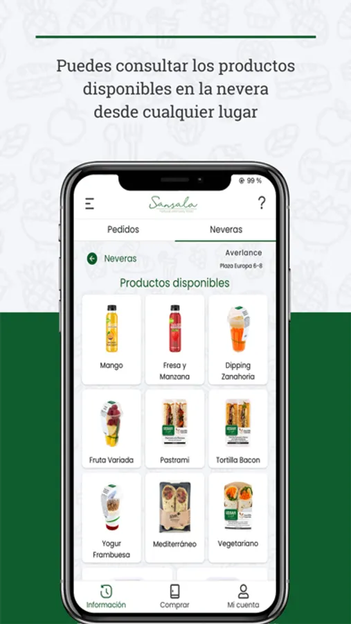 Accede a las neveras inteligentes Sansala y dispón de ensaladas, sándwiches, fruta cortada… Todo elaborado a diario y con productos frescos.