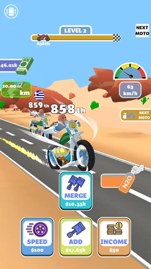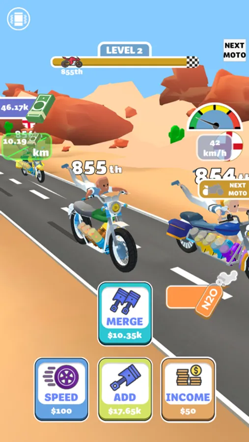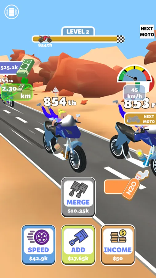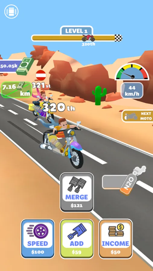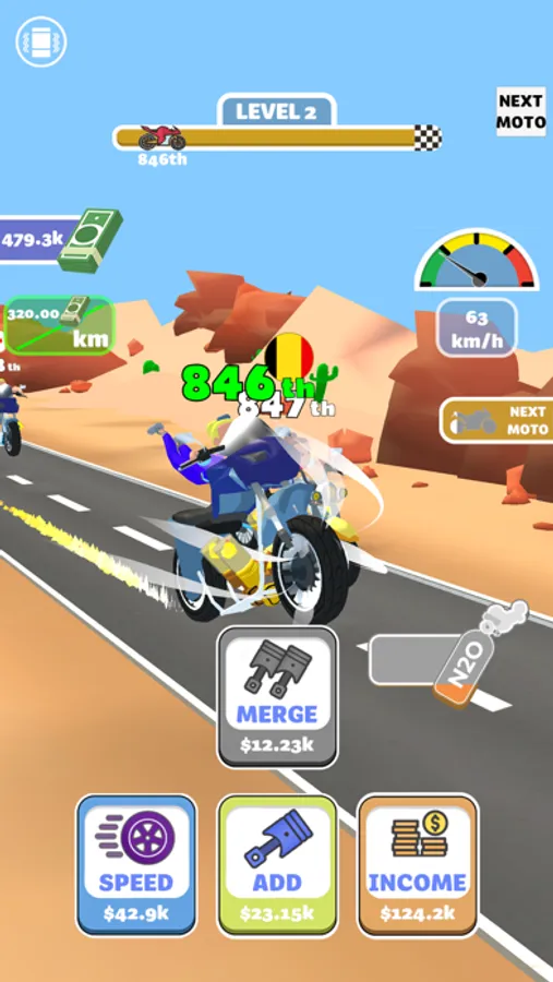 Click to speed up, add pistons and merge them. your bike will be 1. !