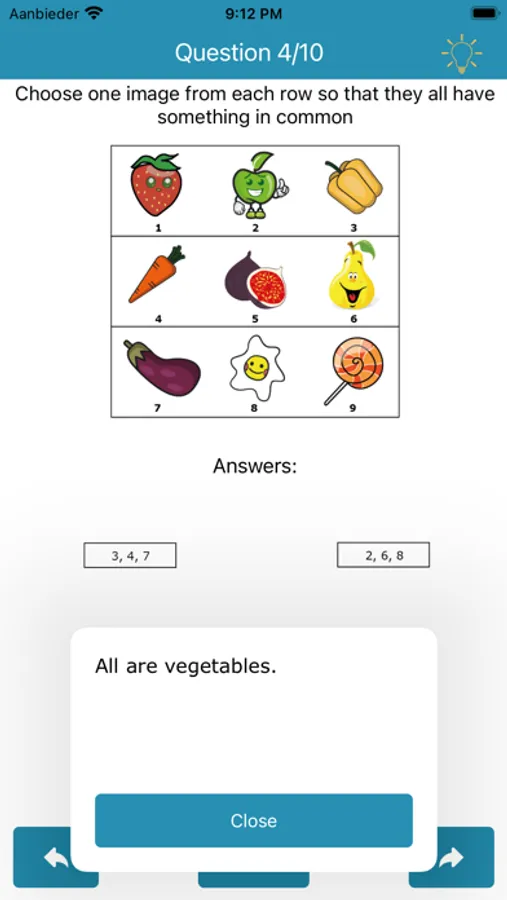 You will be given 4 choices from which to select. You can always use the bulb button (upper-right) to see a hint. The correct answers along with calculated score are proved upon completing the test.