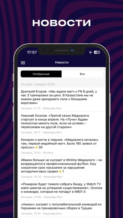 В приложении вы найдете все, что вам нужно о медиафутболе в России и не только: