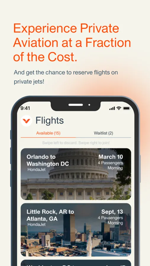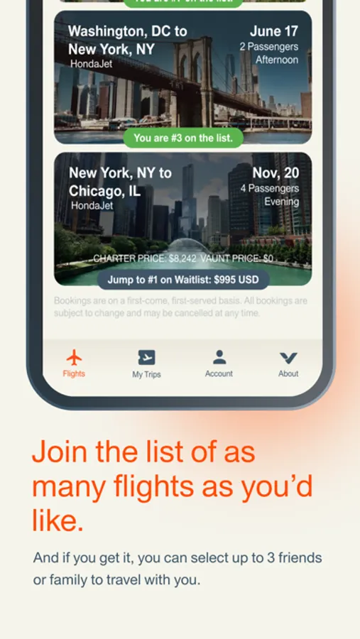 Here’s how it works. New flights are posted to the app every day. Click JOIN to join the waitlist for any flight. Flights are reserved based on your priority in the waitlist, and you can see your place on the waitlist anytime. 24 hours before departure, we will notify the Vaunt member that holds the #1 spot on the waitlist for the flight. If you reserve the flight, we will connect you with a digital concierge team to manage your experience. Pack your bags and get ready to take up to three friends on the flight of a lifetime.