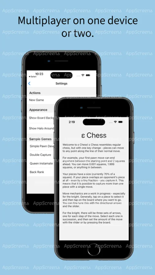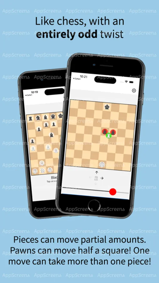 Infinitesimal Chess (ε Chess for short) is like regular chess, but each piece can move a fractional amount. Pieces move along the same paths as in normal chess, but can stop anywhere along that line. If your piece, which has a size, overlaps one or more opponent's piece, you take them. The game ends when you take the opposing king.