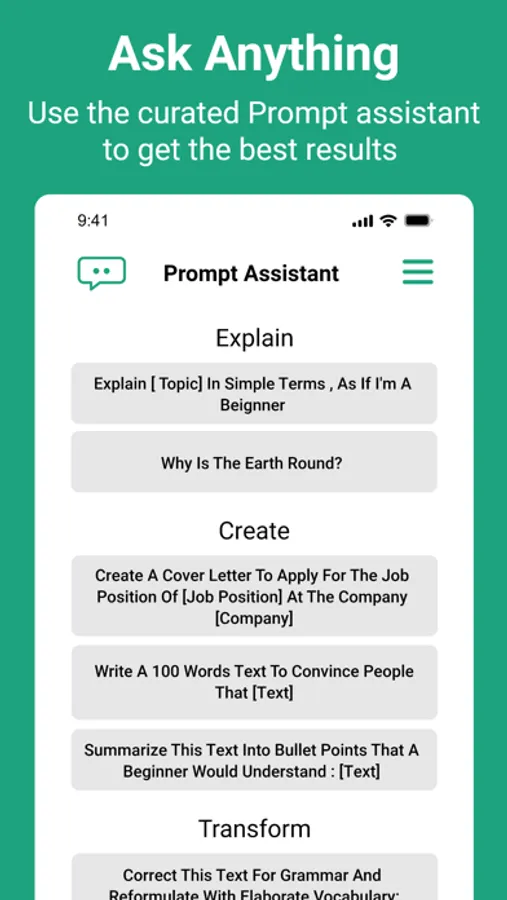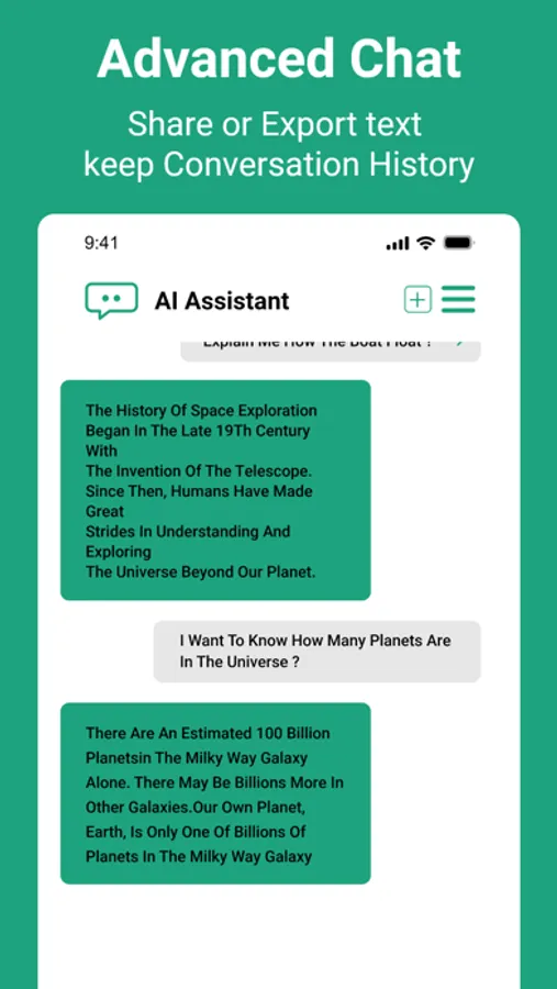 - Conversational user interface for simple use. Just ask, and the AI will respond.