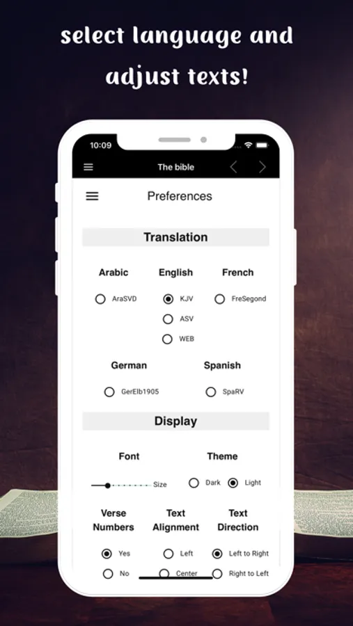 Welcome to our Bible application! With our app, you can easily read the Bible online in multiple languages including English, Spanish, German, French, and Arabic. You can switch between languages with just one tap and read your favorite verses in the language that you feel most comfortable with. You can also search the holy Bible for specific verses or passages, such as Psalm 23, Proverbs 31, or Genesis 1.