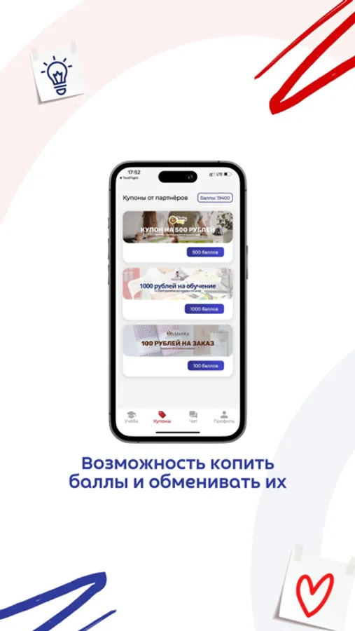 - Возможность копить баллы и обменивать их на купоны у наших партнёров