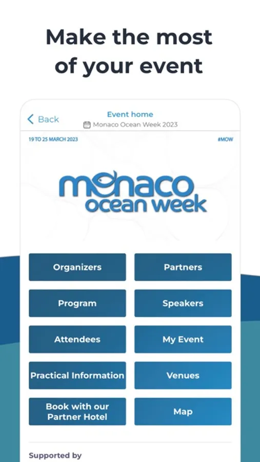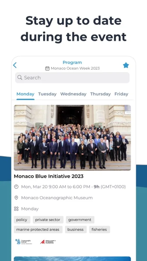 The Monaco Ocean Week is a unique gathering of events dedicated to marine ecosystems awareness and conservation. Every year local and international experts, members of the scientific community and the voluntary sector, as well as public authorities, unite in the Principality of Monaco to share their key marine environment conservation findings and take action to preserve the oceans. The Monaco Ocean Week is jointly organized by the Prince Albert II of Monaco Foundation, the Oceanographic Institute of Monaco, the Scientific Center of Monaco, the Yacht Club of Monaco and the Monaco Government.
