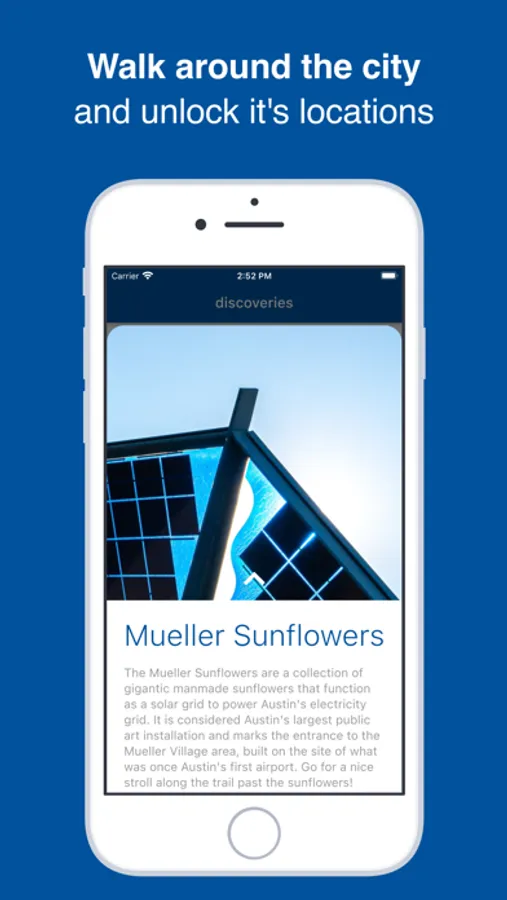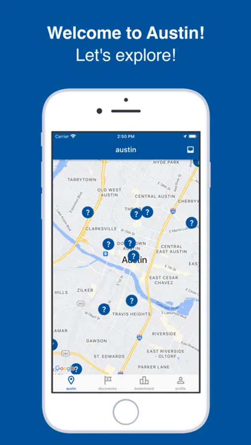 Hello Austin is a new type of guide app focussing on getting you to explore the city on your own. Instead of showing you the highlights of Austin, our maps only show question marks. To find out what these spots are, you will actually have to go there! Once you unlock a location in the app, you will be able to see information about this location.
