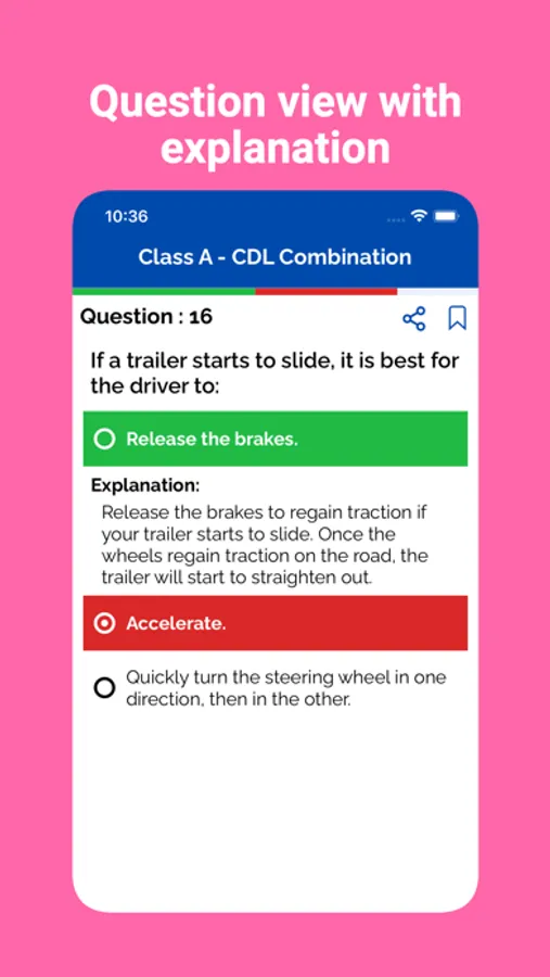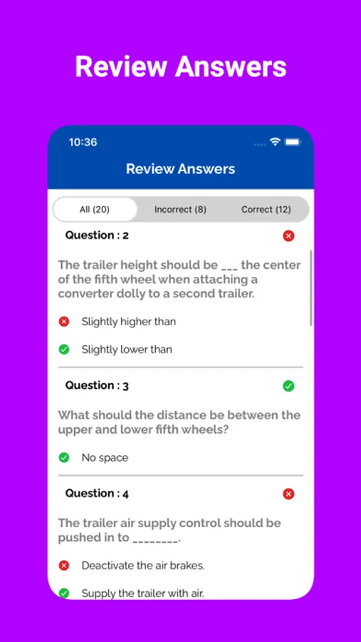 Our app includes a variety of practice questions for the Driver's license exam for Commercial Vehicles. These questions are based on the official handbook of different states.