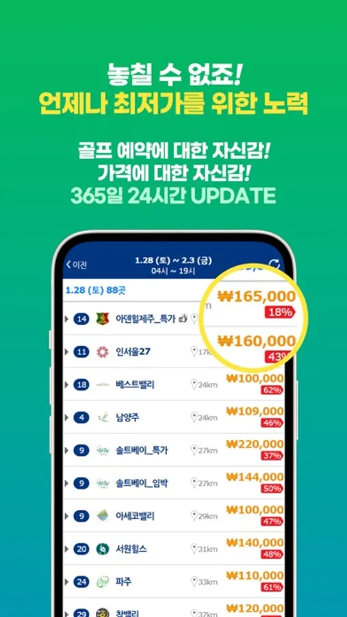 ▶ 거리, 할인율, 최저가, 골프장 이름순에 의한 정렬 기능