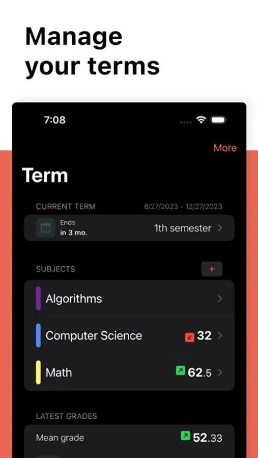 - Terms, Subjects and Grades: GradeX offers a comprehensive grades feature that allows you to define terms, subjects, and grades and even offers charts and statistics to help you keep track of your progress. You can see your average grade for each subject and compare your grades to previous terms to see how you're improving. With this feature, you'll always know where you stand academically and can make informed decisions about allocating your study time.