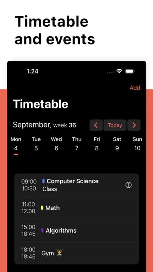 - Timetable: You can easily list all your classes and recurring events, so you always know where you need to be and when. Whether juggling multiple classes, extracurricular activities, or part-time work, our timetable feature ensures you're always on time and never miss a necessary appointment.