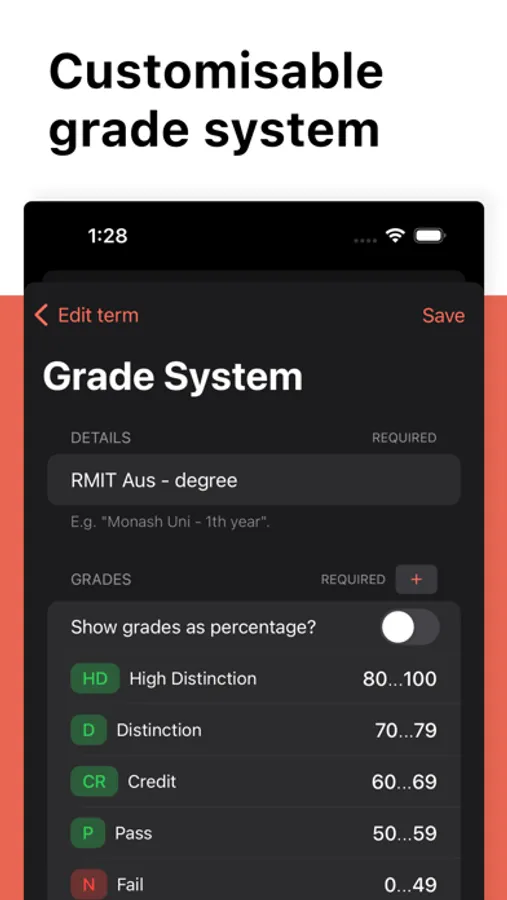 - Customizable grade system: With GradeX you can create your grade scale or map your university/school/college grade system. When you add a new grade, select a grade from the scale and adjust it according to your result. This flexibility ensures that GradeX fits your unique academic standards and requirements perfectly.