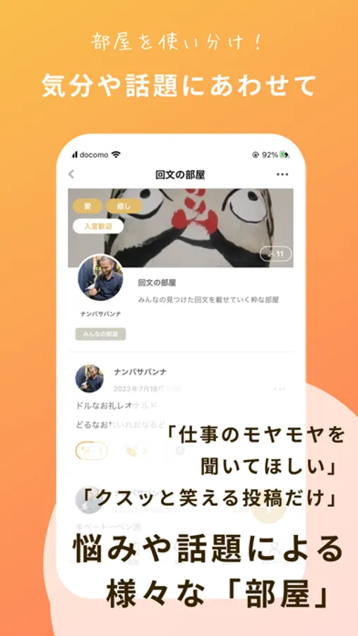 悩みや話題によって「部屋」という単位に分かれています。また、「スタンス」と呼ばれる単語(例:わいわい、ひとりごと)によって、その部屋の空気感を表現できます。そのため、「仕事のモヤモヤを聞いてほしい」「クスッと笑える投稿だけ見ていたい」など、そのときの気分や話題に合わせて使い分けることができます。