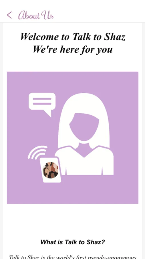 Talk to Shaz is an app made for women, where users can remain psudeo-anonymous while tackling loneliness and/or struggling mental health before it declines to a diagnosis. A platform, where you can connect with many around the world, without needing to have anything in common, except for this: wanting to express how you feel and being present for one another. Talk to Shaz, we're here for you.