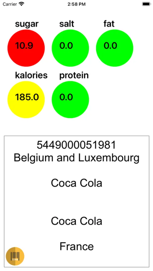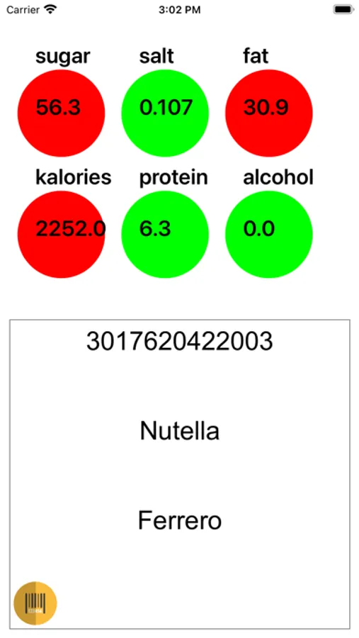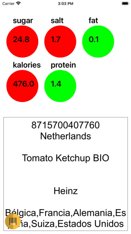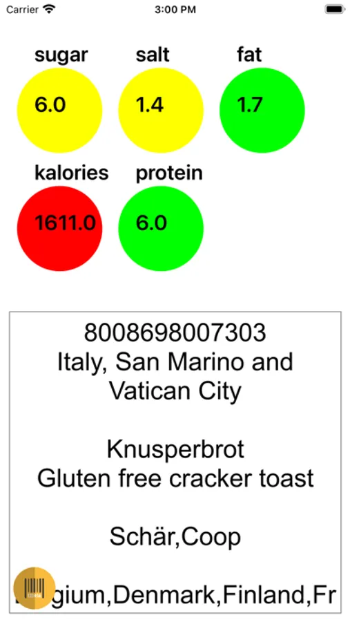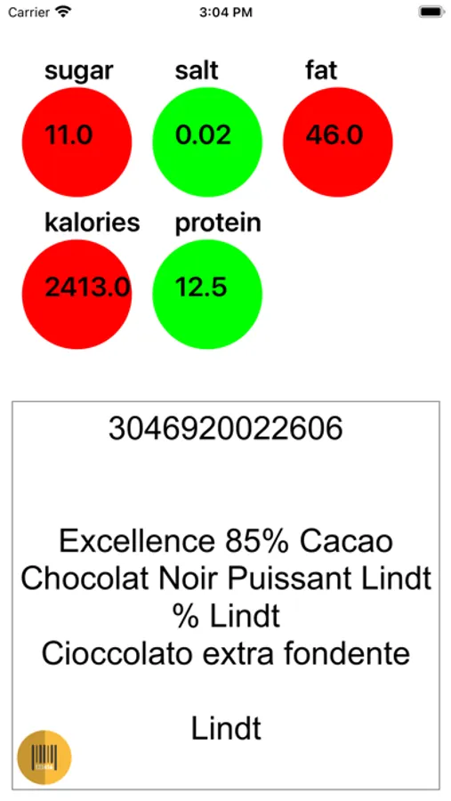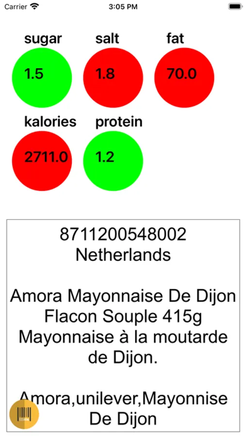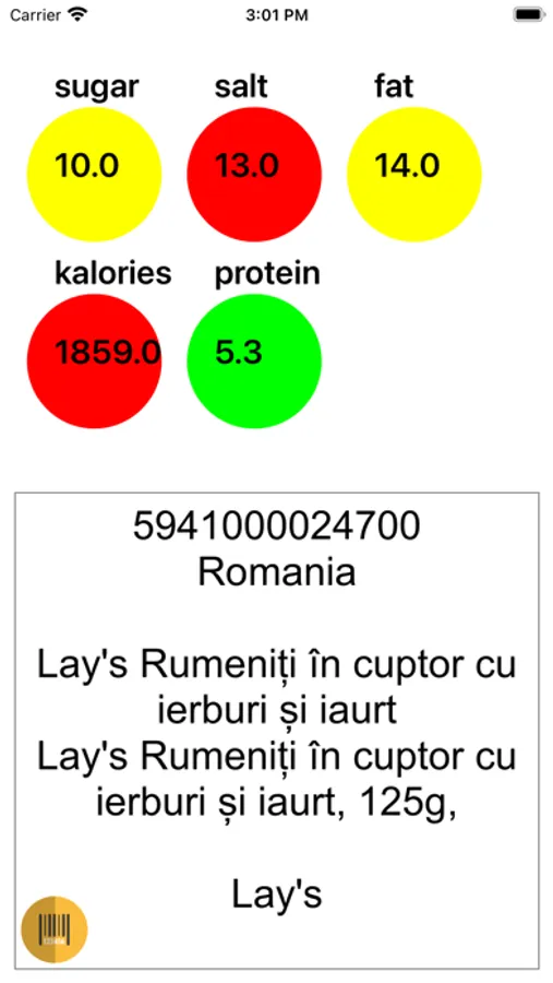 - Circles change color to green, yellow or red depending on the amount of sugar, salt, etc. in the product.