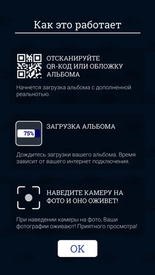 Дополненная реальность, Augmented Reality (AR) – технология, которая расширяет наш мир, добавляя к нему интерактивные возможности. Альбомы и фотографии с AR позволят Вам увидеть то, что раньше можно было только вообразить. Наведите камеру на изображение — и оно оживет!
