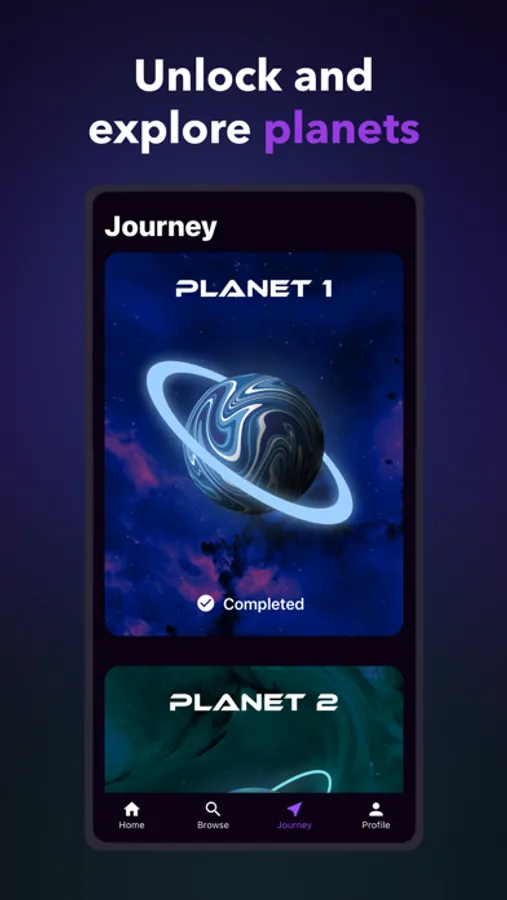 A unique feature of our app, planets make meditation much more fun and motivating. The more you meditate, the more planets you can unlock. Each planet has multiple levels (each level is one meditation), which all have to be completed before you can unlock the next planet. You start on the Planet 1, which is already unlocked by default. You start completing levels on Planet 1. After you completed all levels, you unlock Planet 2, and so on. We regularly add new planets with new levels so there will always be more for you to explore. Planets are designed to keep you motivated in a fun way, and to make sure you meditate regularly for a longer period of time.
