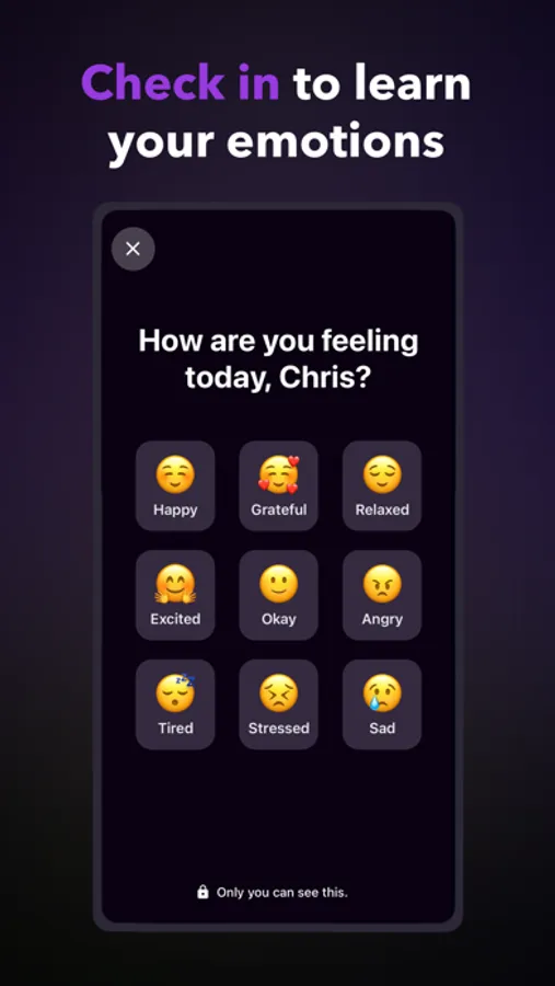 Every day, you can check-in how you are feeling that day, and write down what's on your mind. All your check-ins will be displayed in one place, so you can go back in time and see if your moods have improved over time and learn more about your emotions. You can see percentage of how many times you felt happy, sad, worried, etc. We kept your privacy in mind, so you don't have to be worried that anyone but you will ever read your journals.