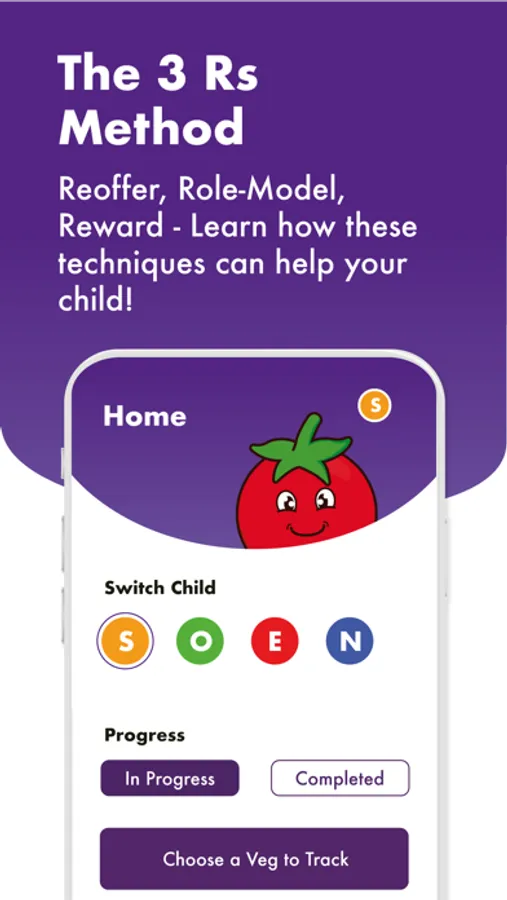 The app includes tips and information for encouraging children to eat vegetables (including the 3 Rs method – Reoffering, Role-modelling, Rewarding), as well as tools to help you put them into action.