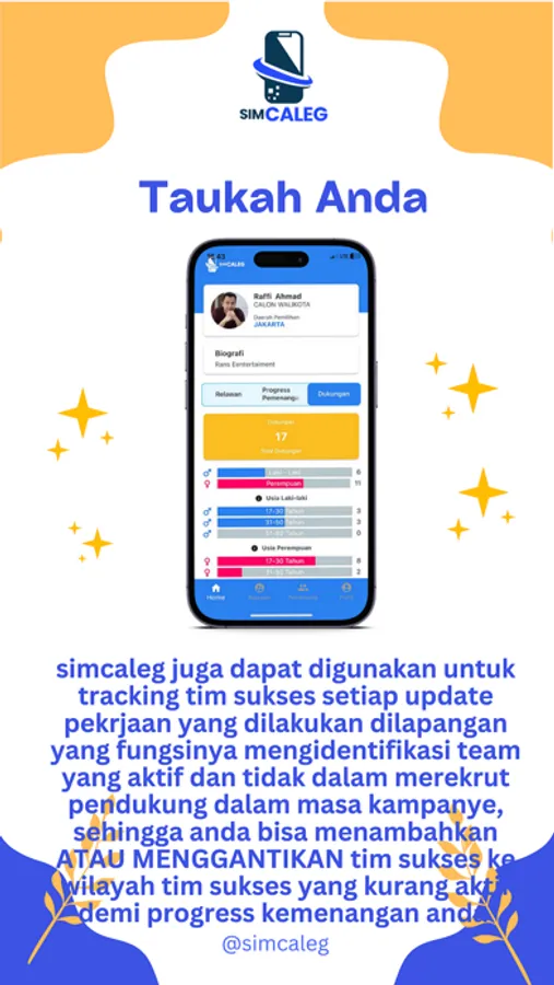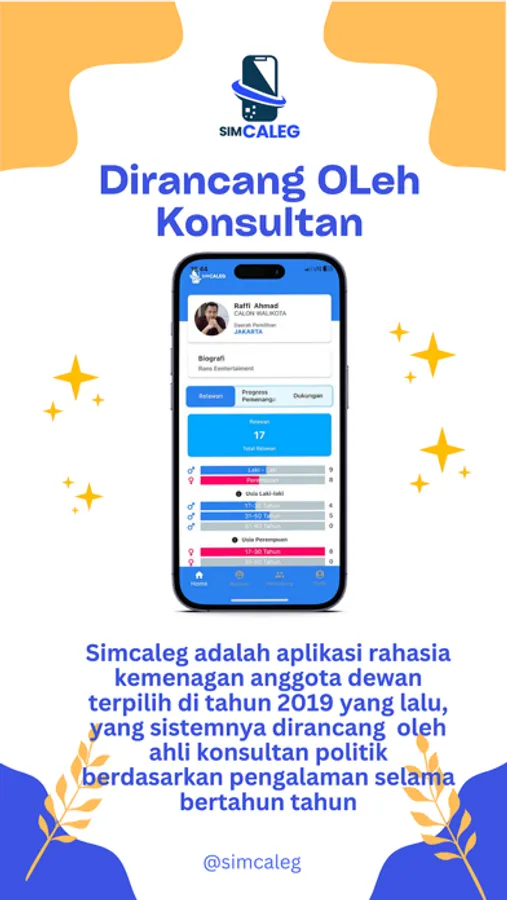 SimCaleg atau Sistem Informasi Calon Legislatif adalah aplikasi yang akan fokus membantu Anda dalam manajemen tim sukses dan pendukung pada Pemilihan Legislatif 2024 yang akan datang.