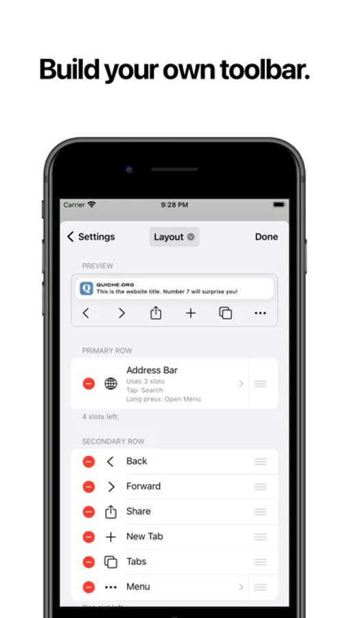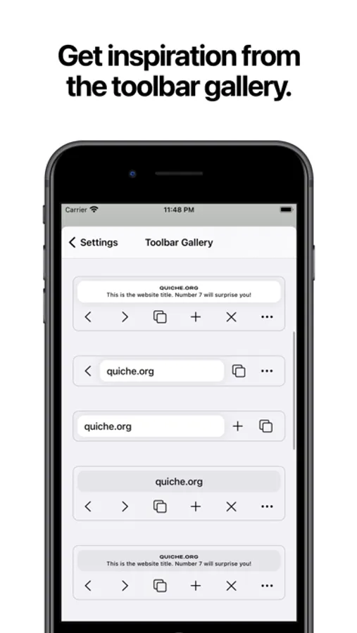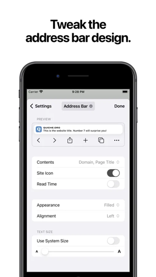 • Personalize the address bar contents: show the page title, read time, site favicon, adjust the text size, and choose from a range of elegant visual styles.