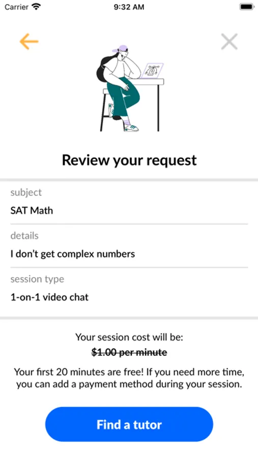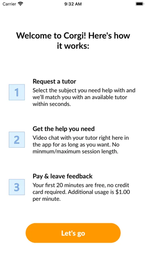 With Corgi, you can get matched with one of our top-tier tutors and hop into a live, 1-on-1 video chat session in seconds. No minimum session times: whether it takes 10 minutes to get unstuck or 1 hour to master a new concept, you'll only pay for the time you need.