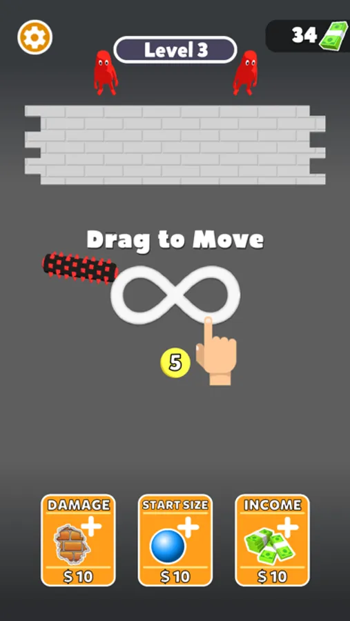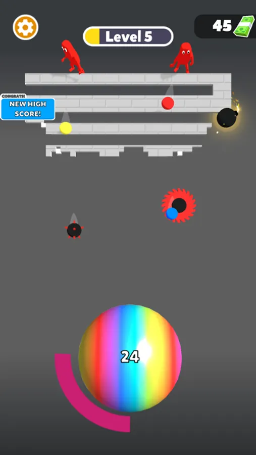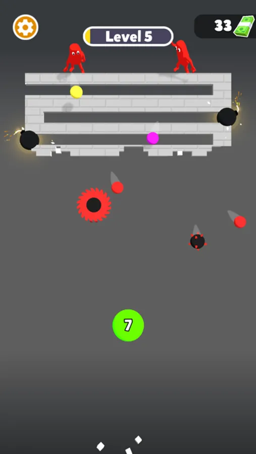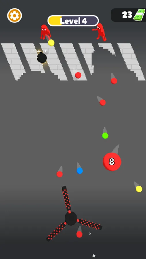 Collect balls of the same color to break more walls and make a shot. Avoid obstacles and collect features.