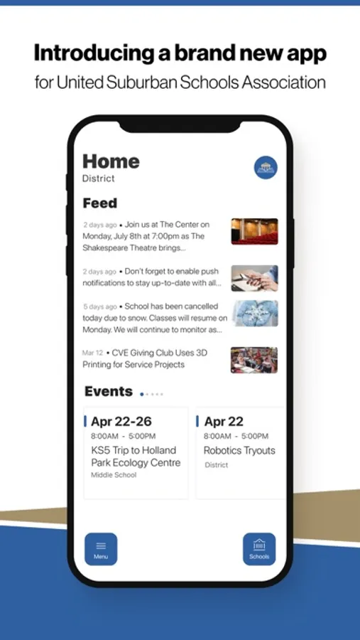 The event section shows a list of events throughout the district. Users can add an event to their calendar to share the event with friends and family with one tap.