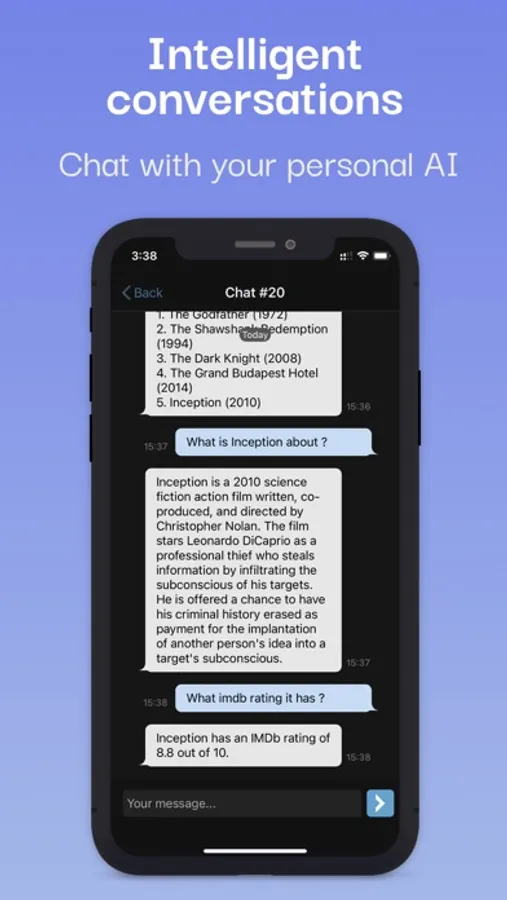 It is your gateway to the future with AI. Our app utilizes the latest ChatGPT model from OpenAI that allows you to have an intelligent conversation with a sophisticated AI. It combines natural language processing, predictive analytics, and machine learning to deliver the most intelligent AI experience available.