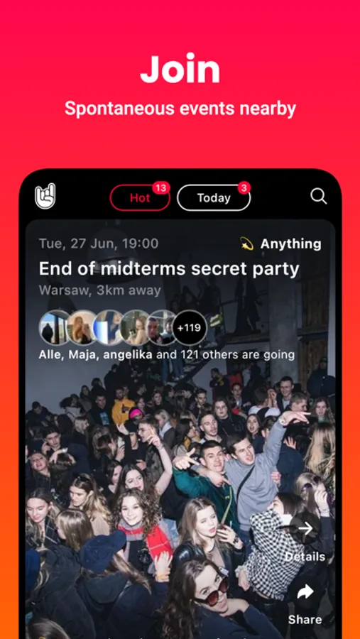 Massive house parties, chill hang-outs, sports matches, and everything in between. Meet people by going out together.