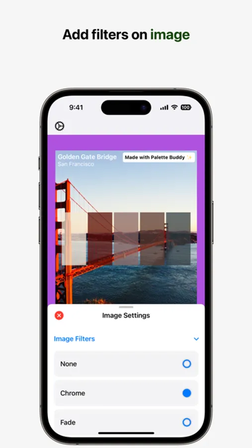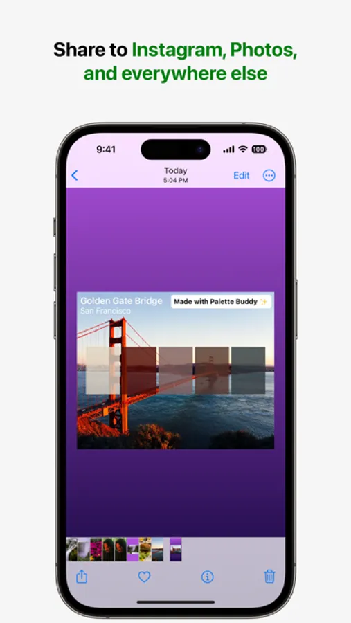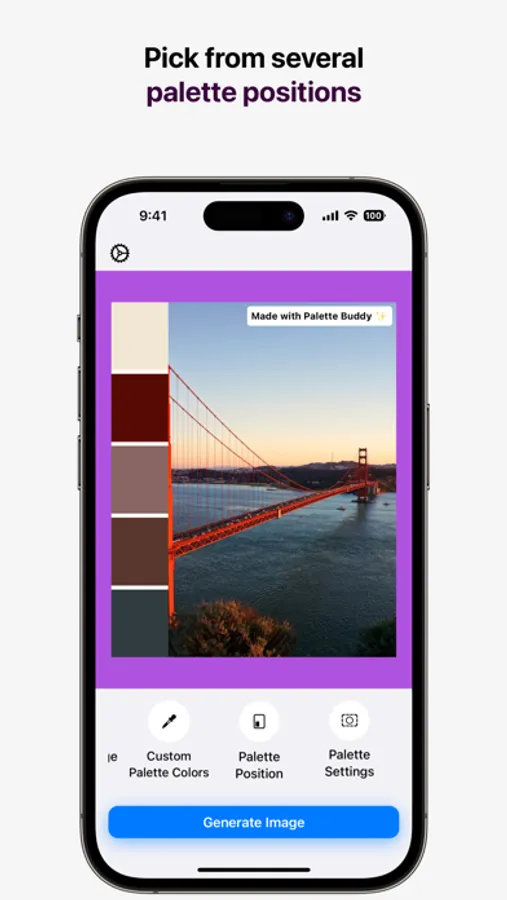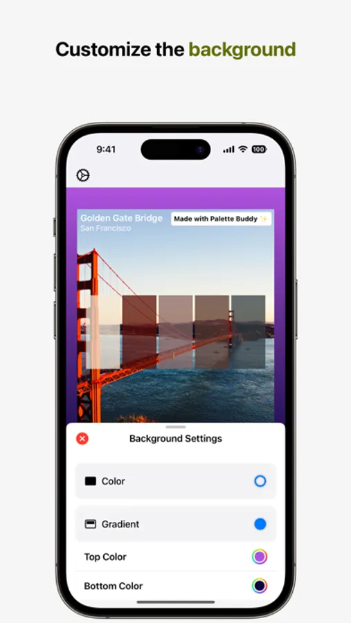 Introducing the ultimate color palette generator app! Say goodbye to boring, generic color schemes and hello to endless creative possibilities. Load any image and watch as the app generates a stunning color palette with just a few taps. Take your color palette to the next level with a variety of customization options including palette positioning, image filters, and a custom palette color picker. Experiment with different color combinations and find the perfect scheme for your next project. And the best part? Share your unique, custom palettes directly on Instagram stories. Whether you're a designer, artist, or just looking to add a pop of color to your social media, this app has everything you need to elevate your game. Download now and start creating beautiful color palettes today!