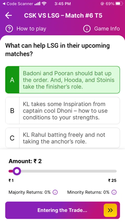 In Qunions Trades, all questions have multiple opinion-based options. Users can invest in any option within a minimum and maximum range for that trade. 2 out of all options in any trade are winning options. The option that is selected the most is the "Majority" category winning option, and the option that is selected the least is the "Minority" category winning option. All investments on the winning options yield returns based on their respective winning category's final return percentage. All other investments that are not on the winning options yield no returns. Each winning category’s current “Win return” percentage is displayed at the bottom of the trade. So, be “most popular” or “most unique” in your opinion to compound your investment.