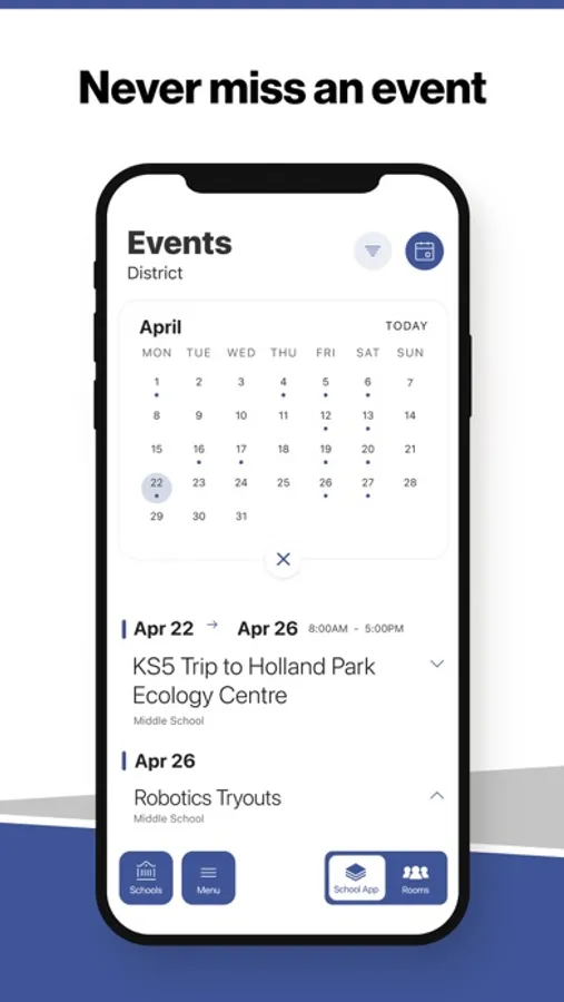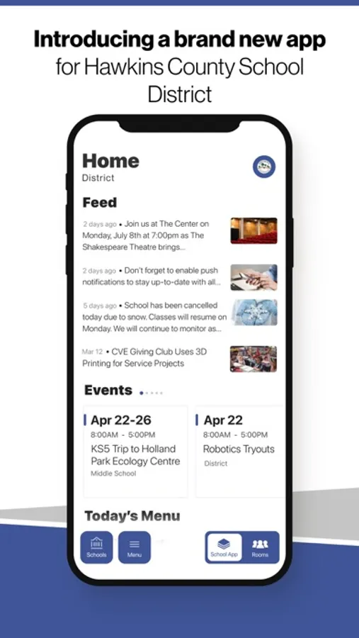 The event section shows a list of events throughout the district. Users can add an event to their calendar to share the event with friends and family with one tap.