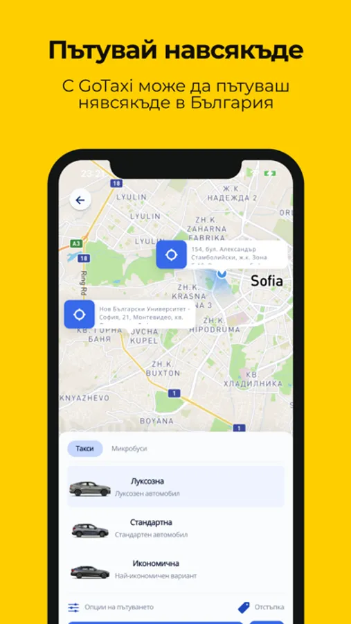 GoTaxi ти позволява да пътуваш бързо и удобно в цяла България, без да сваляш стотици приложения или да говориш. Всичко за такси в едно приложение.