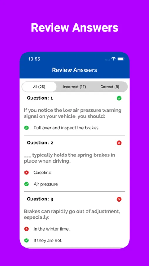 The app includes a variety of practice questions for the CDL exam. These questions are based on the Iowa CDL handbook Users can track their progress and identify areas where they need more practice, allowing them to focus their studying on the areas where they need the most improvement.