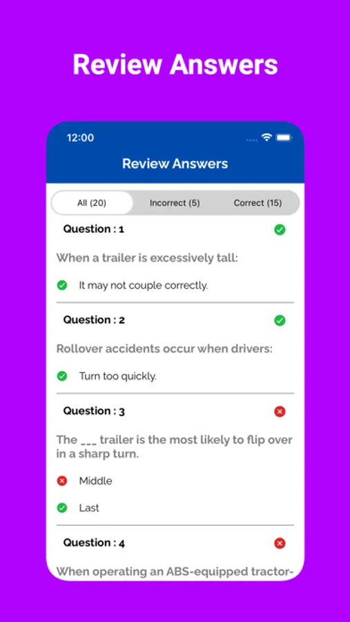 Our app includes a variety of practice questions for the Driver's license exam for Commercial Vehicles. These questions are based on the official handbook of different states.
