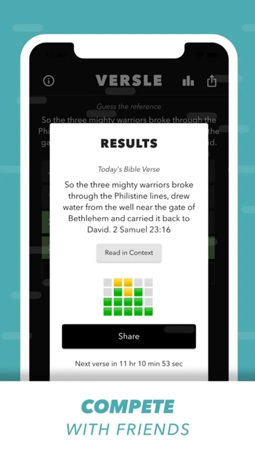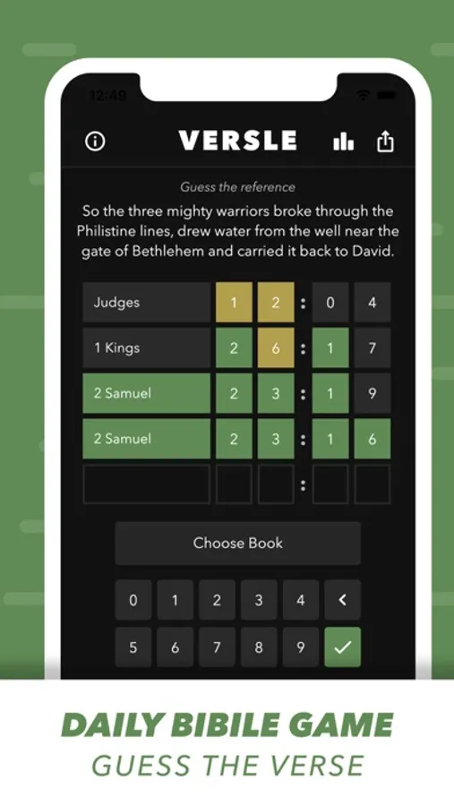 Play Versle to discover the daily Bible verse! Every 24 hours a new verse is able to be guessed. You have 5 attempts to identify the book, chapter, and verse for the Scripture given. Hints can assist you as you guess! Can you guess the Bible verse reference in 5 tries or less?