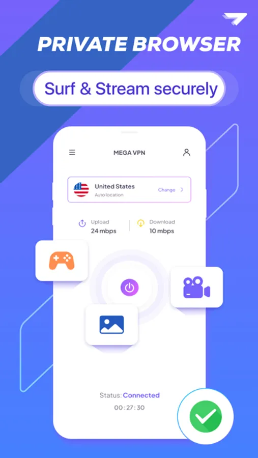 Mega VPN is easy to use super fast, unlimited & private VPN (Virtual Private Network) to proxy sites, watch videos and movies with faster speed, protect WiFi security, and protect your privacy. It hides and changes your IP address, encrypts your internet traffic, turns public Wi-Fi into a private network, and lets you access content safely and anonymously.