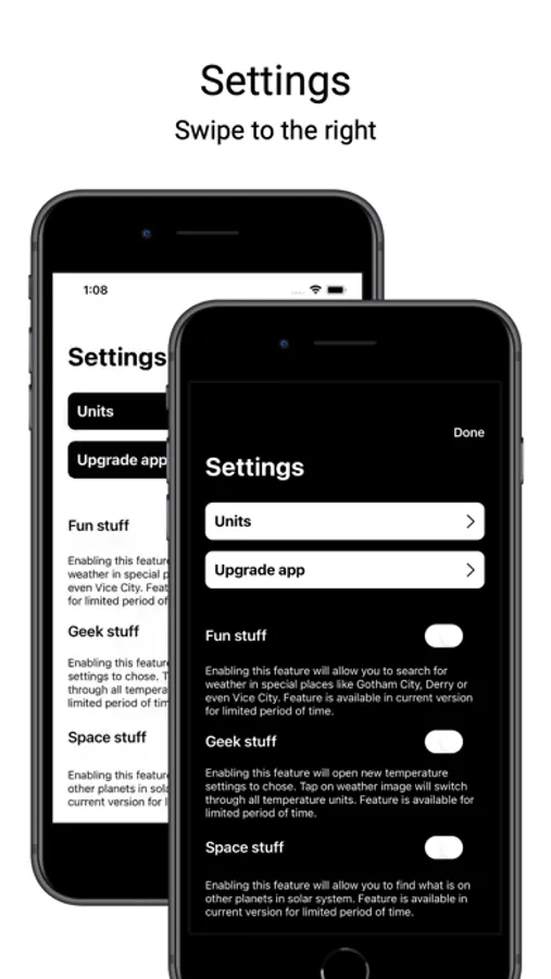 Our new and improved settings screen is highly customisable, allowing you to choose between Celsius, Fahrenheit, and Kelvin temperature units, miles or kilometers for visibility measure units, and different pressure units. With a swipe to the left or right, you can easily access the settings screen, which features a sleek and sophisticated dark theme. Swipe the settings screen to close it, making it easy to navigate and use.