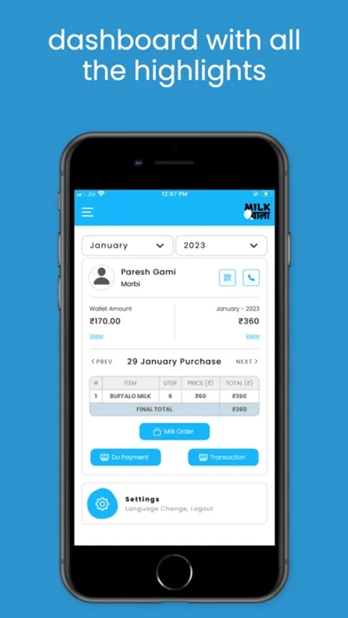 This customer application allows users to easily order milk, view their current bills, and pay those bills all in one convenient location. With this app, users can quickly and easily place an order for milk delivery, view their current bills and previous transactions, and pay those bills using a secure and reliable payment system. Whether you're a busy parent trying to keep your fridge stocked with milk for your kids, or a business owner looking for an easy way to manage your milk deliveries, this app is the perfect solution. With its user-friendly interface and powerful features, it's never been easier to stay on top of your milk orders and payments.