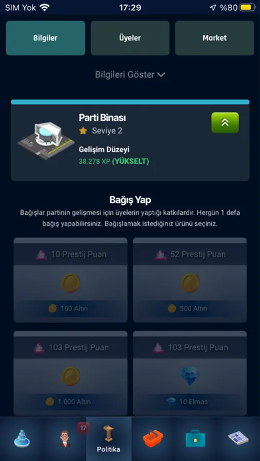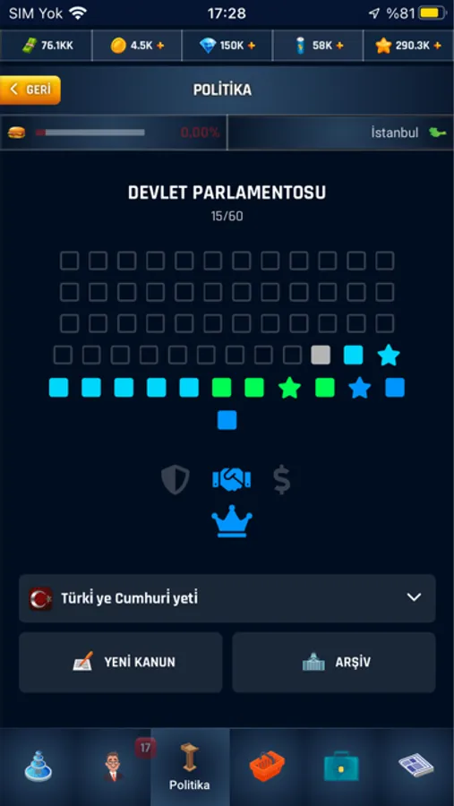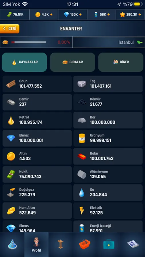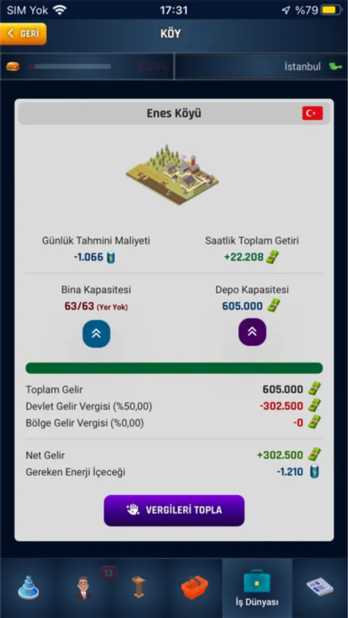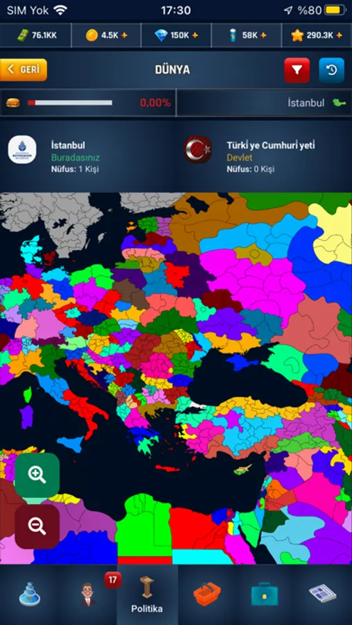 By improving your skills in Sim Of World, you can defeat your enemies, form a party and have a say in the administration of your country. Almost all cities in the world are available in the game. Find your own city and build the political order you dream of. Travel between regions and work in the mines. Process the mines you earn from mining operations in your factories, produce materials, weapons, food and take your place in world trade. Deal with the states and produce for them. They will need you to improve their buildings. There are 5 different battle modes in the game. These are land warfare, naval warfare, occupation, coup d'etat and insurrection. Protect your own country or expand your territory by participating in wars! If you say that I have nothing to do with war, I like trade, produce and sell weapons, food! Build your own country in an independent region. You will need 5 people to do this. After establishing your country, you can choose your own form of government. You might consider becoming a dictator, monarch, prime minister, or head of state. It's up to you to decide what kind of leader you will be! You will have a social area in the game. From this area you can write your own articles and share your thoughts with other players. You can also chat online with players from all over the world. Participate in the competitions held every week and win big prizes. Be one step ahead in the rankings, let everyone hear your name! Log into the game every day and collect your daily rewards. You will have extra options for more rewards whenever you want. Fulfill the tasks given to you and win lots of rewards. Raise your achievements and get ahead of your rivals! Come on, join us now!