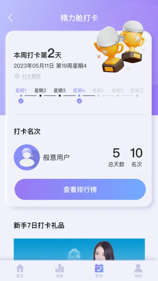 般意是一款服务于硬件设备的手机应用。应用内容包含硬件设备使用手册、打卡排行榜、冥想视频课程等功能