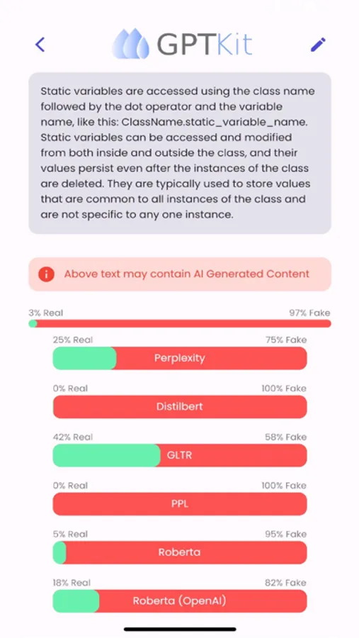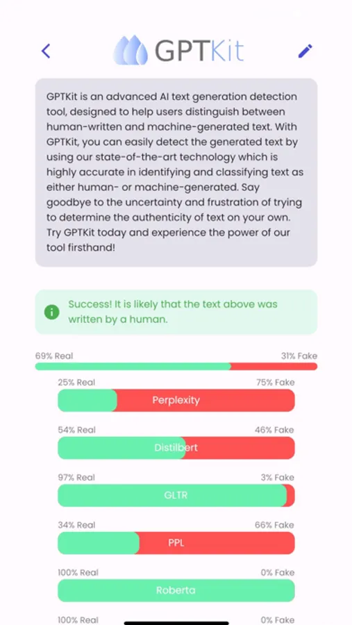 GPTKit is an advanced AI text generation detection tool, designed to help users distinguish between human-written and machine-generated text. With GPTKit, you can easily detect the generated text by using our state-of-the-art technology which is highly accurate in identifying and classifying text as either human- or machine-generated. Say goodbye to the uncertainty and frustration of trying to determine the authenticity of text on your own. Try GPTKit today and experience the power of our tool firsthand!