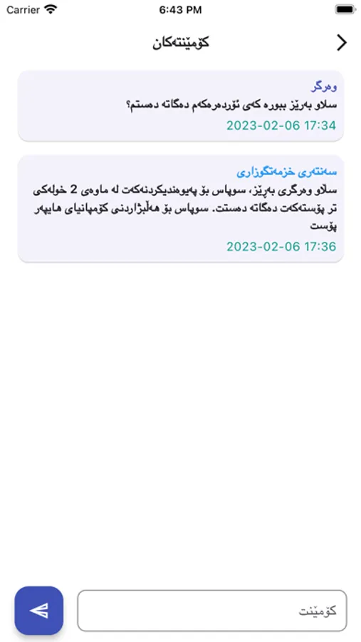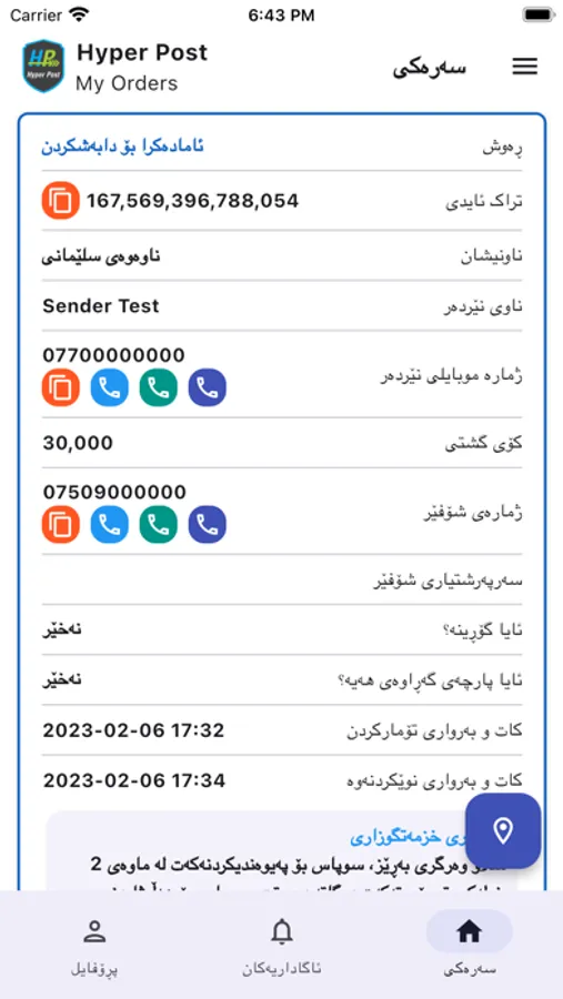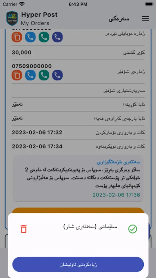 ٤- دەتوانیت کۆمێنت بنوسیت بۆ شۆفێر و نێردەر و سەنتەری خزمەتگوزاری هایپەرپۆست دەربارەی پۆستەکەت.