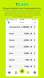 Günlük olarak gelir ve gider takibi mi yapmak istiyorsunuz? Ay, çeyrek ya da yıl sonu bütçenizin istediğiniz seviyede, öngördüğünüz gibi gerçekleşmesini mi istiyorsunuz? Şahsi hesaplarınızı, aile bireylerinizin, ekip üyelerinizin, arkadaşlarınızın, çalışanlarınızın gelir ve giderlerini tek bir hesapta toplayıp detaylı takip etmek ve geriye dönük raporlarla verimliliğinizi hesaplamak mı istiyorsunuz? TKASA tüm bu işlemleriniz için size en kolay ve konforlu çözümü sunuyor.
