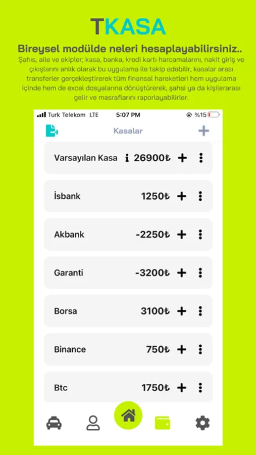 Şahıs, aile ve ekipler; kasa, banka, kredi kartı harcamalarını, nakit giriş ve çıkışlarını anlık olarak bu modül ile takip edebilir, kasalar arası transferler gerçekleştirerek tüm finansal hareketleri hem uygulama içinde hem de excel dosyalarına dönüştürerek, şahsi ya da kişilerarası gelir ve masraflarını raporlayabilirler. Bireysel modül ücretsiz olarak sunulmaktadır. Ekip lideri olarak giriş yaptıktan sonra ekip üyelerini uygulamaya davet edebilirsin. Ekip üyeleri ve ekip lideri – her bir kendi harcamalarını ve gelirlerini kendi cihazlarında kayıt etmeye başlarlar. Sonrasında her iki taraf ta detaylı raporlar alarak tüm gelir gider hesabını pdf, jpeg ve exceller de raporlayabilirler. Bu sayede net kar otomatik olarak hesaplanır. Her bir kullanıcının net karı ayrı ayrı raporlanabilir. Aile içinde, küçük işletmelerde, arkadaşlar/ekipler arasında gerçekleşen gelir ve gider hesaplamalarını bu uygulama ile kolay ve hızlı takip edebilirsiniz. Ekip liderleri şahsi kasalar oluşturabilir. Her bir banka hesabını, kredi kartı hesabını, kredi borç hesabını isimlendirerek bu uygulamada ayrı ayrı kasalarda takip edebilirler. Ekip üyelerinin kayda aldığı gelir ve giderler ise sabit/varsayılan kasa – isimli kasaya yansır, bu sayede ekip liderinin şahsi kasaları ile karışmazlar.