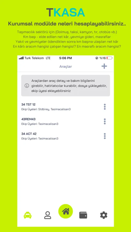 - Uygulamayı satın alan araç sahipleri (uygulama içinde Patron olarak nitelenen kişi) bir ve ya birden fazla adet plaka / araçta bir ve birden fazla ekip üyesi ataması yapabilirler.