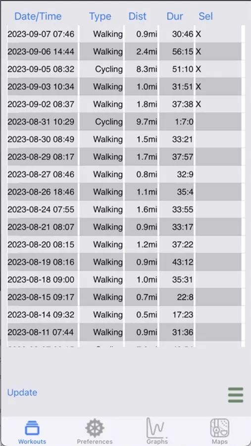 * Workout sessions are displayed in a grid where they can be sorted by date, type, active calories, steps, heartrate, distance, pace, duration or elevation.