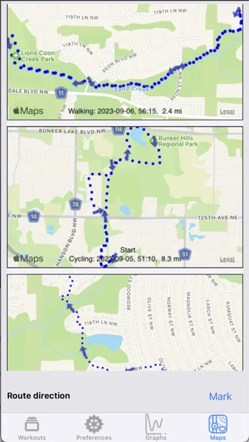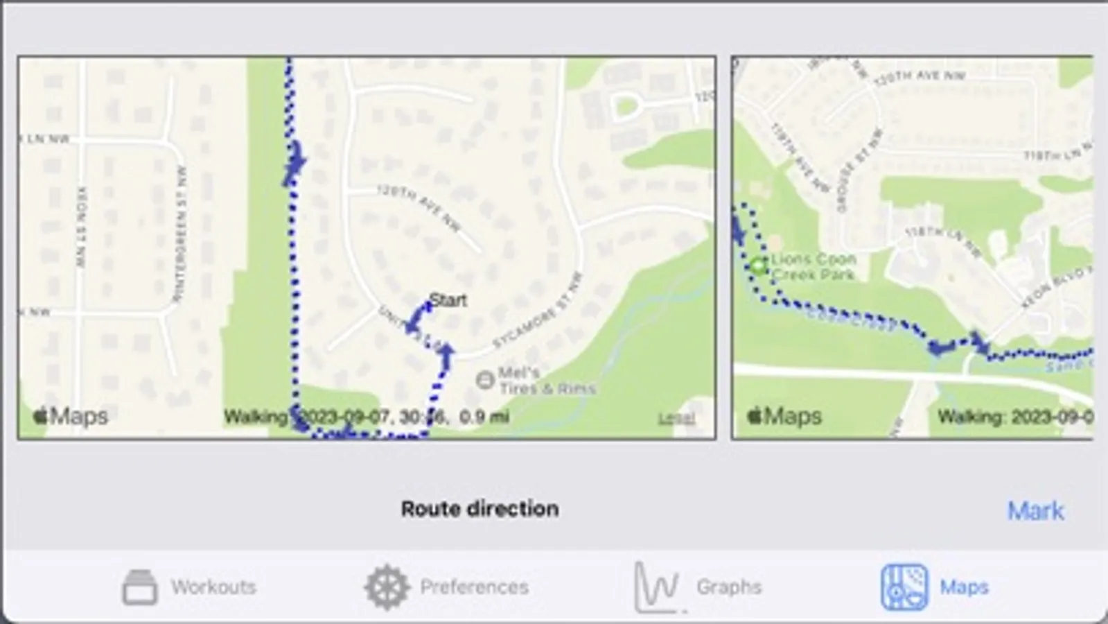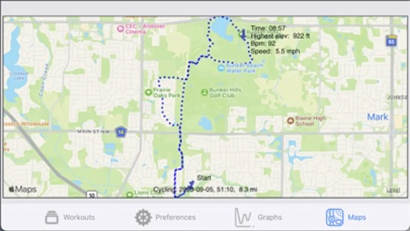 Displays annotated maps for each workout. Each map shows workout route with direction, highest and lowest elevation, speed and maximum heart rate and mid-point of workout.