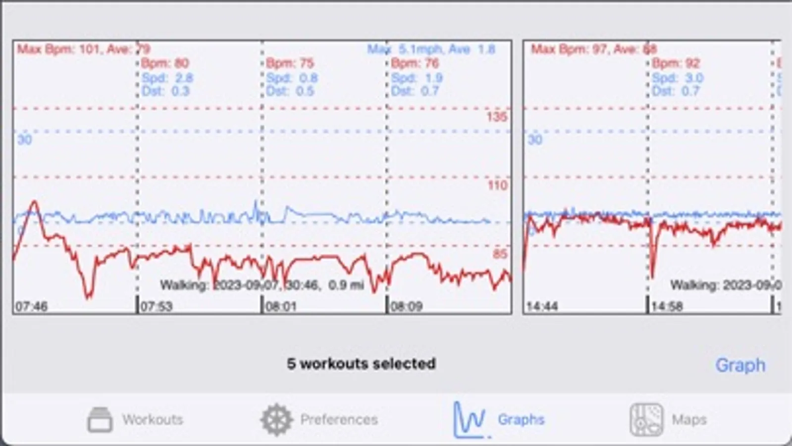Workout Comparator gives you the ability to set common scales of your choosing and apply it to all your workout sessions. Select particular workout sessions and graph heart rate and speed during the workout.